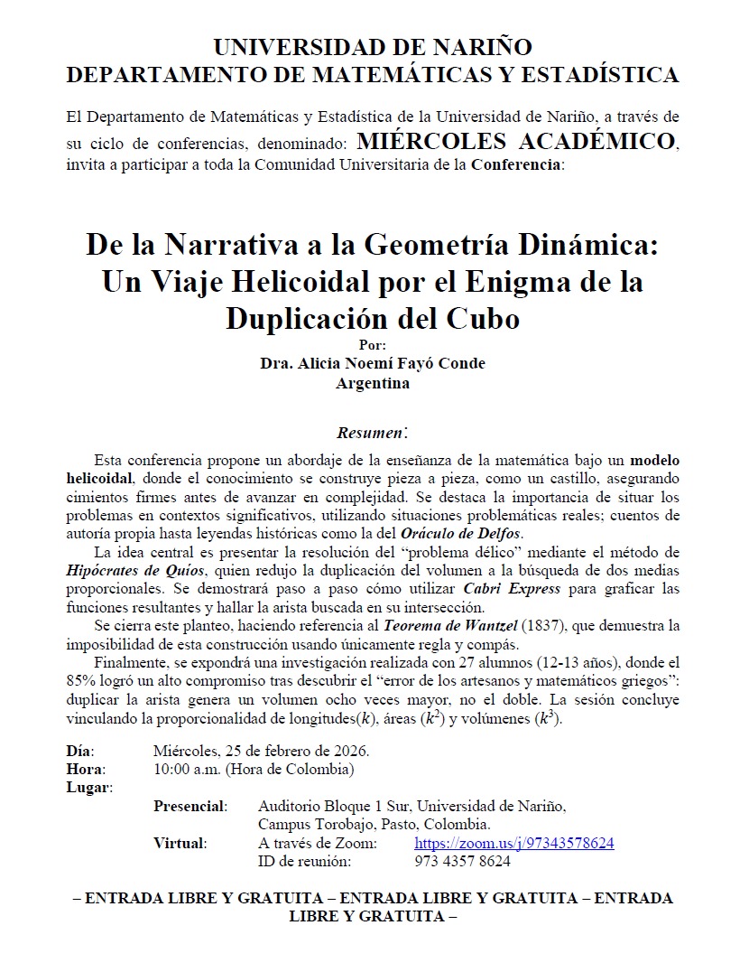El Departamento de Matemáticas y Estadística de la Universidad de Nariño, a través de su ciclo de conferencias denominado MIÉRCOLES ACADÉMICO, invita a participar a toda la Comunidad Universitaria en la conferencia: